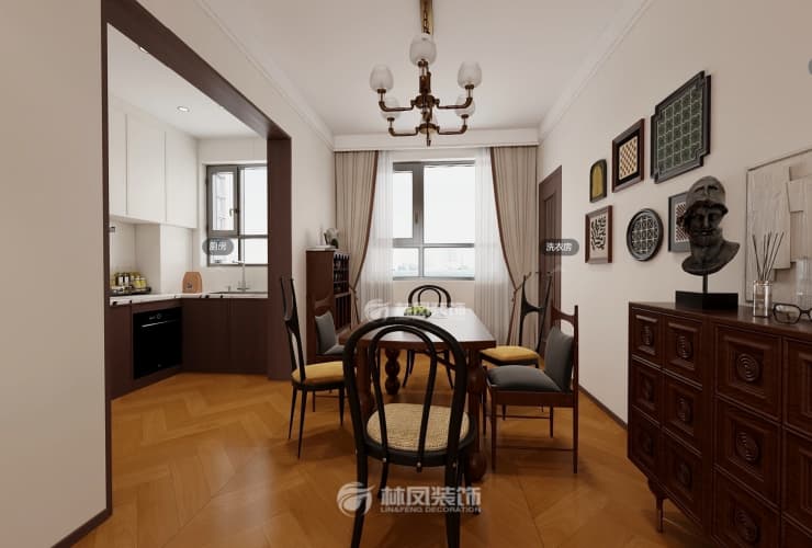 餐厅采用开放式布局,让空间更加通透,视野开阔,餐桌的设计线条简洁,融入复古的金属框架、雕花等元素,增添韵味。餐厅与厨房之间相互渗透,方便家庭成员在做饭和用餐过程中的交流与互动。