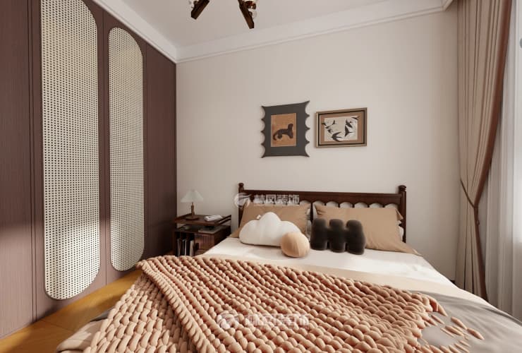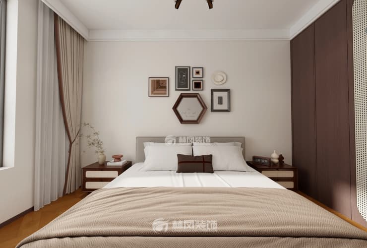 选择米白色或淡米色的墙面漆,这种柔和的色调能够为卧室奠定温馨而淡雅的基调,木质家具采用深胡桃木色或复古橡木色。例如,床架和衣柜,深木色不仅体现了木材的质感,还传达出一种古老而稳重的气息。