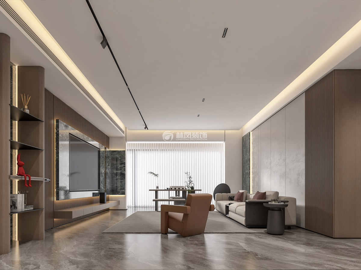 本案户型客厅属于常规开间户型,通过石膏线叠级工艺的设计,让整个空间更加宽敞大气,又不失温馨。又结合新型装饰灯,加强了空间的照明。