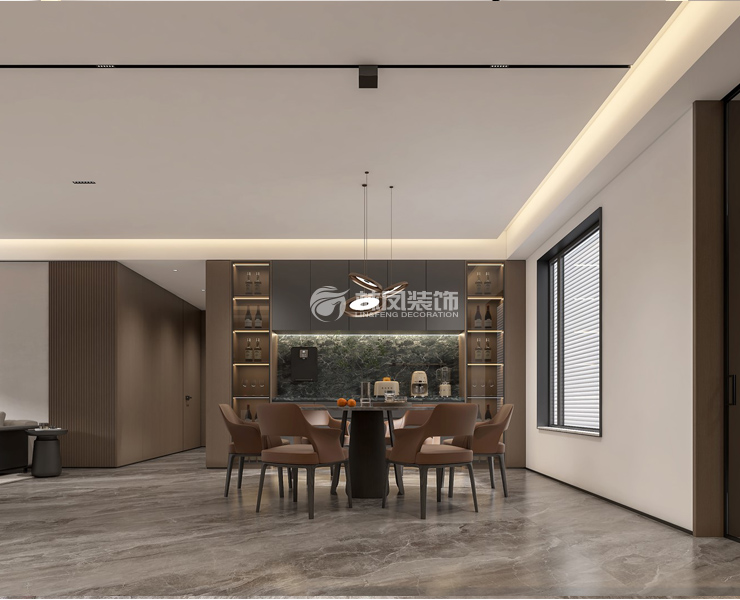 本方案餐厅和厨房相邻,用餐桌划分空间,保证视野开阔性,敞开式的设计,让空间有了延伸感。还有设计了休闲区,在享受美食后有了一个放松身心的去处。通过餐边柜的设计,增加了物品的收纳空间。