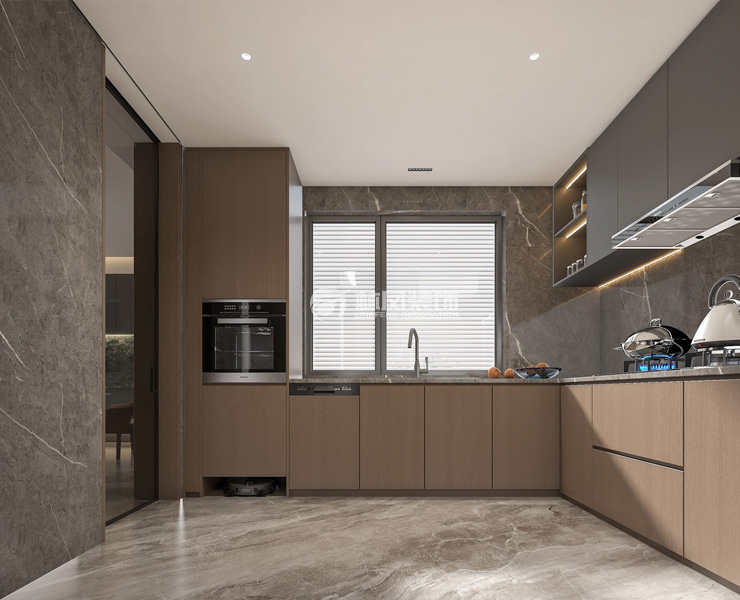 厨房采用大块墙砖,显得大气,冰箱,厨房却不显得拥挤,U形橱柜与吊柜充分保证了空间的使用率,台面布置符合中国人习惯的“洗切炒”做饭流程。