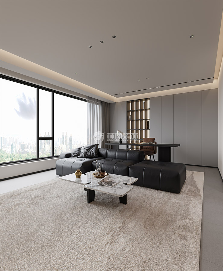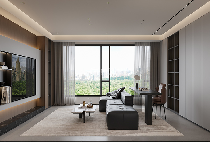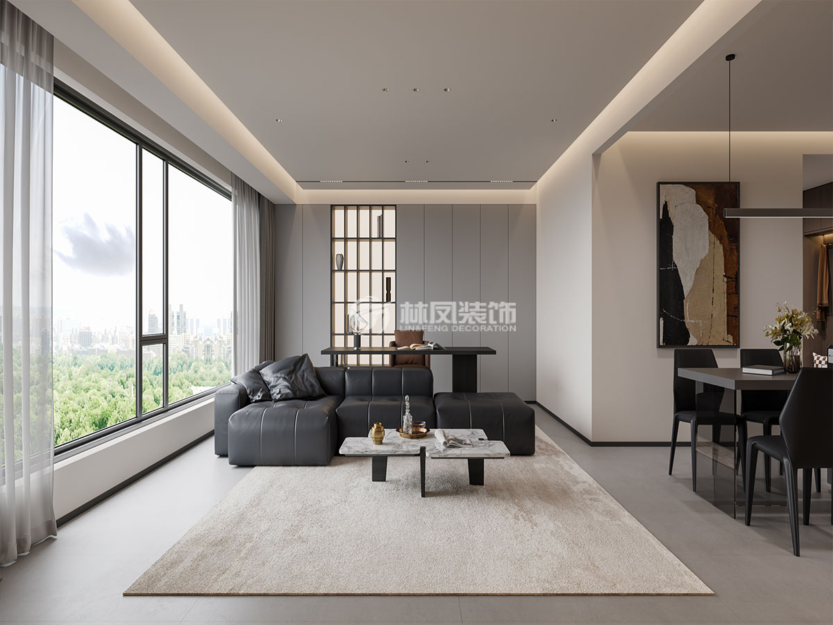 客厅以开放式格局呈现,大面积落地窗引入充足自然光线,窗外景色成为天然装饰。