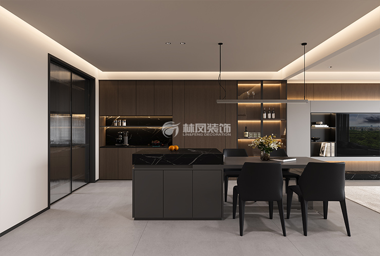 厨房设计兼顾美观与实用。L型或岛台与餐桌结合的布局,操作流程顺畅,方便日常烹饪与家人互动。深木色的整体橱柜搭配黑色大理石台面,质感十足。