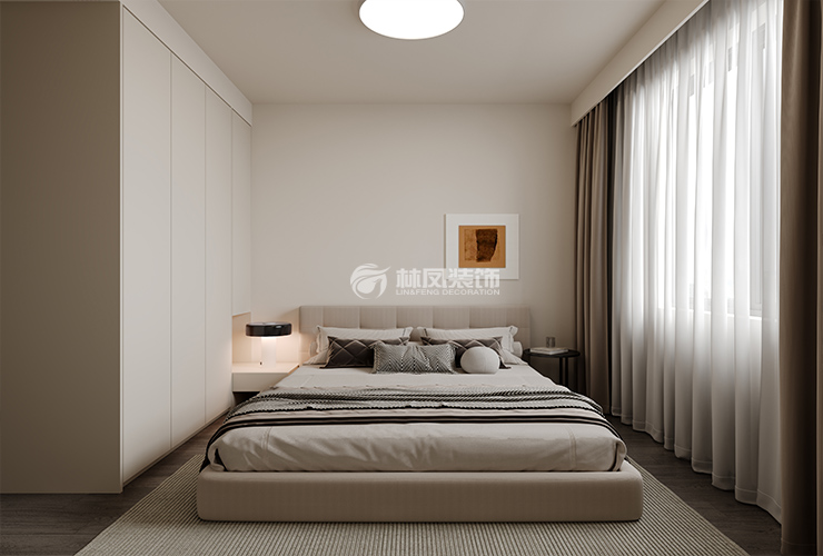 卧室追求宁静舒适的休憩氛围,以浅米色、米白色墙面搭配深色木地板,温馨自然。