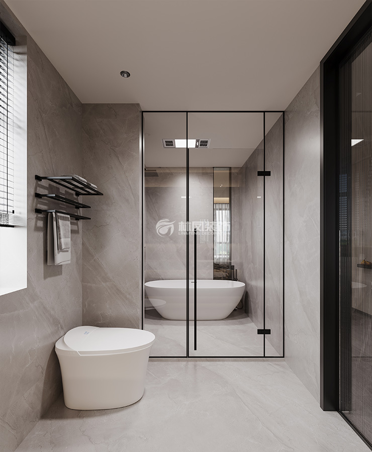 卫生间采用干湿分离设计,提升使用效率和安全性。以米色、白色大理石为主材,搭配黑色五金件,简约又高级。