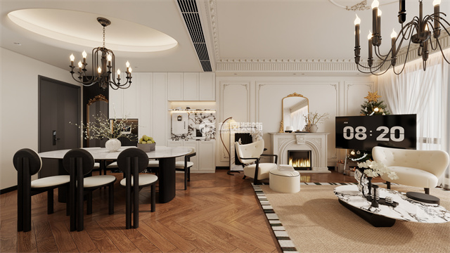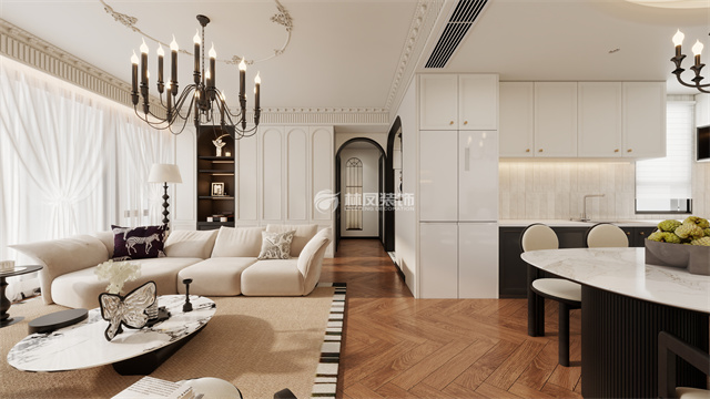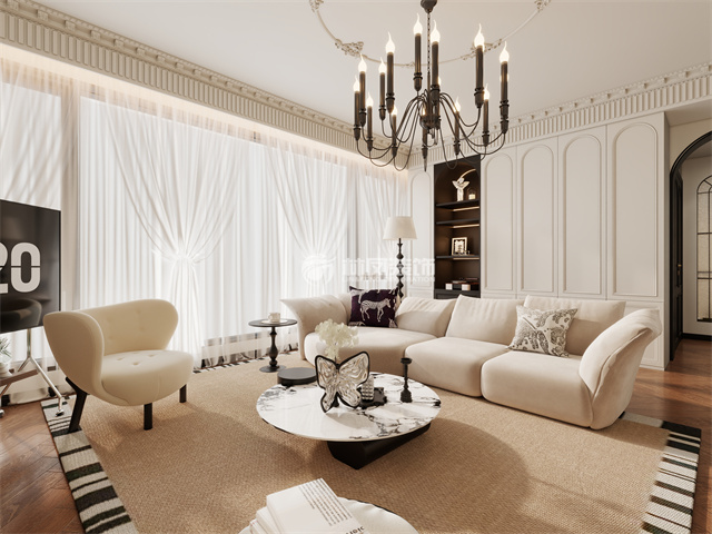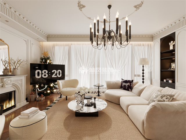 法式线条,层次分明,空间大气,石膏线吊顶层次分明,,衬托出前面米色沙发,空间感十足,大吊顶配合篝火造型增加温暖,高端美感兼具,给人眼前一亮。