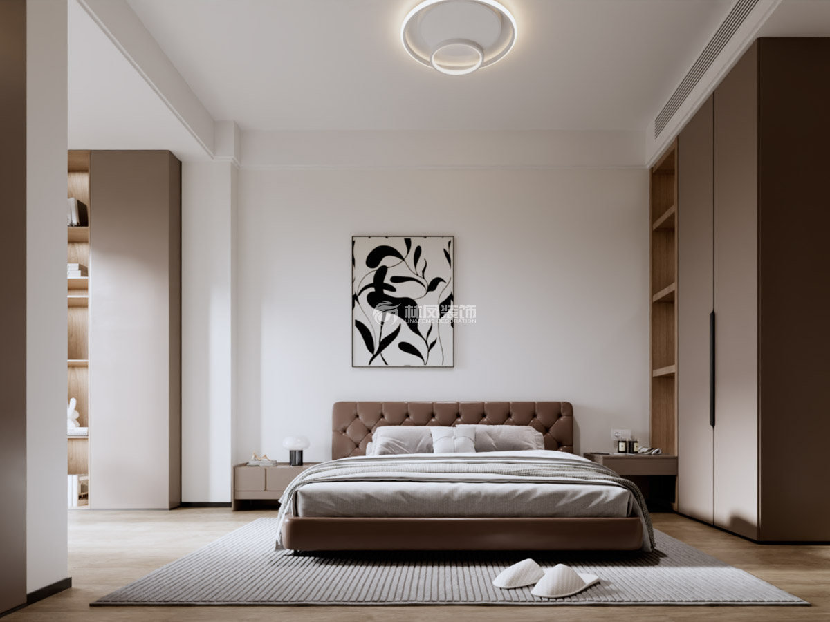 卧室墙面以浅灰色墙布为基底,床头背景墙采用硬包材质,搭配金属线条装饰,提升质感。深灰色皮质床具搭配同色系床品,两侧摆放造型简约的金属台灯。定制通顶白色衣柜,柜门采用玻璃与板材拼接设计,内嵌灯带,既实用又美观。无主灯设计结合暗藏灯带与床头壁灯,营造温馨舒适的休憩氛围。