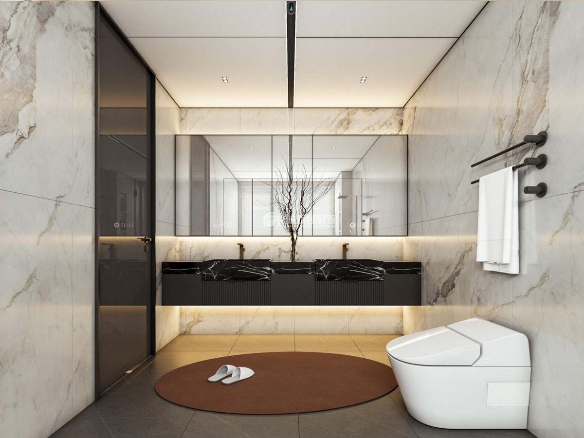 卫生间墙面采用鱼肚白大理石瓷砖通铺,地面搭配深灰色防滑大理石地砖,形成强烈的色彩对比。洗漱区采用悬浮式岩板一体盆,搭配黑色不锈钢柜体,安装智能防雾镜并配备环形灯带。淋浴区采用黑色极窄边框玻璃隔断,搭配恒温花洒,营造出精致时尚的卫浴空间。