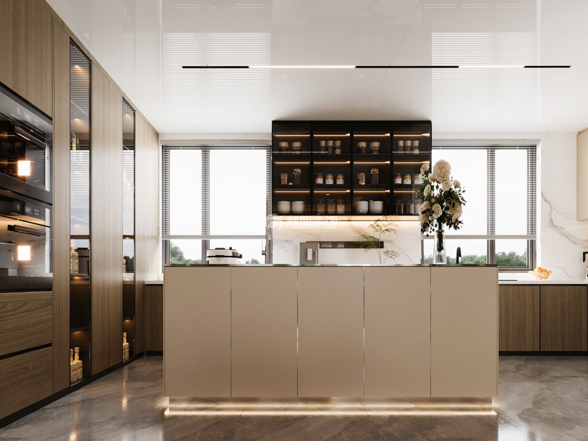 厨房采用U型布局,橱柜选用哑光黑色烤漆面板,搭配玫瑰金色隐形拉手,尽显高级感。台面采用白色岩板材质,耐磨易清洁。墙面铺贴爵士白大理石瓷砖,搭配嵌入式筒灯与柜底灯带,整体空间明亮通透,现代感十足。