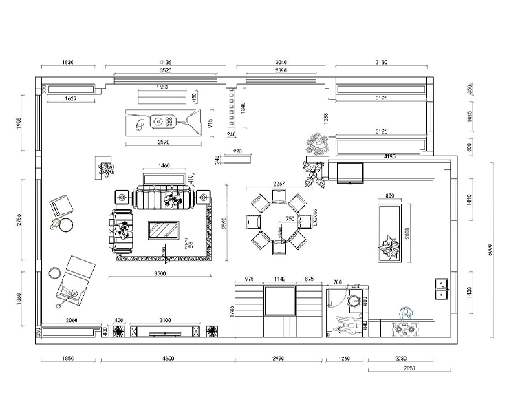 客厅地面铺设深灰色大理石瓷砖,搭配同色系美缝,呈现浑然一体的视觉效果。电视背景墙采用岩板与金属线条结合的设计,底部悬空并嵌入暖光灯带,增强空间立体感。L型深灰色真皮沙发搭配黑色金属脚,搭配白色大理石纹理茶几,顶部无主灯设计结合磁吸轨道灯与筒灯,营造出简约而不失格调的会客空间。