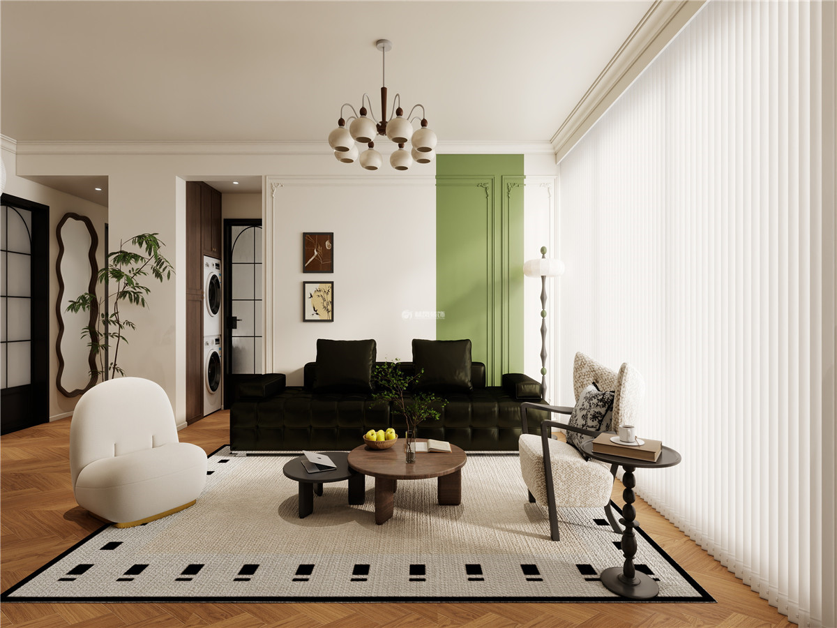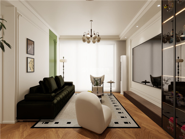 客厅采用了大面积的实木复合地板人字拼铺设,沙发、电视柜等采用深色和墙面的白色作为呼应、增加视觉效果,沙发背景墙采用法式线条和雕花,小面积刷绿色乳胶漆,给客厅增添了清新、活泼的氛围,使整个客厅更加优雅浪漫、增加整体性。