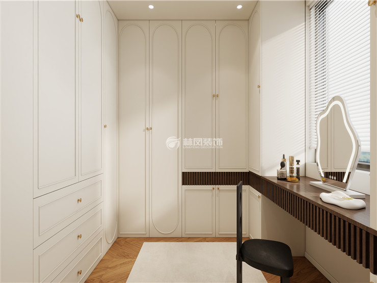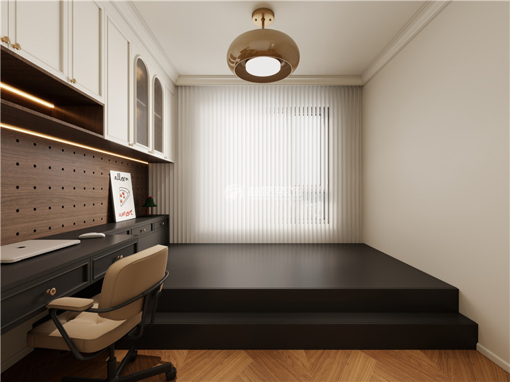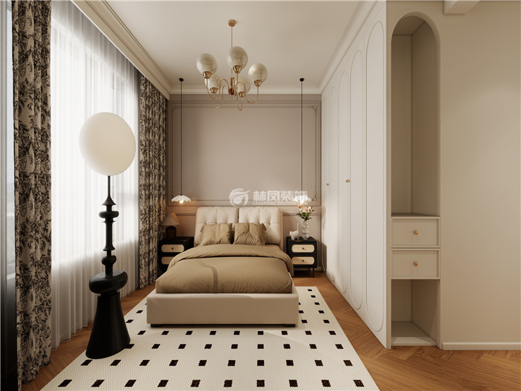 主卧和客餐厅整体色调保持一致,使空间整体保持和谐自然的氛围,中古风的床头柜和斗橱等家具,增添了复古浪漫的法式元素,床头背景墙面雕花和奶咖配色,很好的糅合了整个环境的色差,错落有致,使整个卧室看起来更加浪漫和舒适,充满高级感。