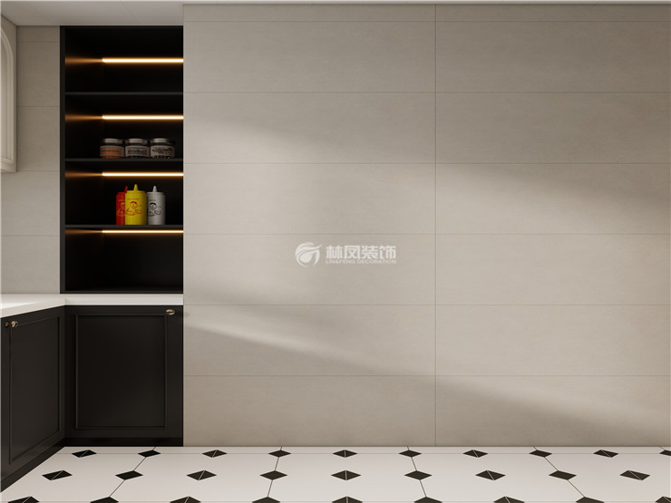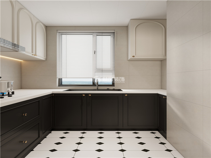 封闭式厨房,墙面浅色柔光砖和地面花砖相得益彰,法式橱柜柜门设计增加氛围感,浅色为主给人提供了休闲、轻松愉悦的环境,黑色柜门的地柜使整个房间颜色过渡十分舒服。
