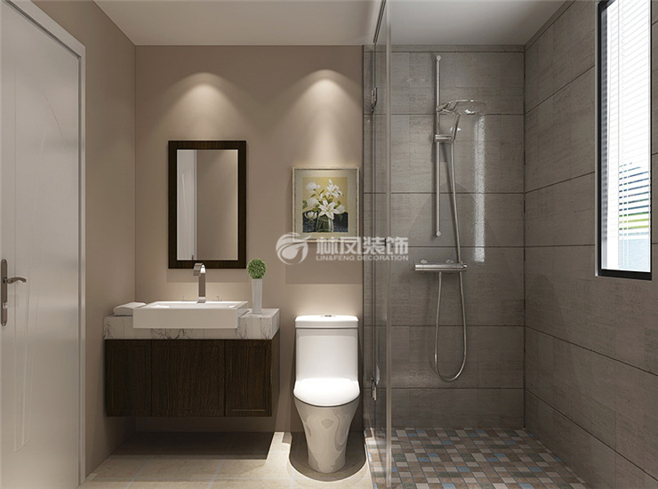 主要使用素色的乳胶漆以及墙砖,没有过多的饰品,加之顶棚的筒灯,使得卫生间显得更加和谐。