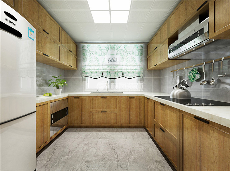 这个厨房空间使用原木色u型橱柜,简洁方便,让空间看上去更宽敞明亮,北欧风的舒适休闲理念完全体现而出。橱柜和地砖色彩成对比,视觉感更强。