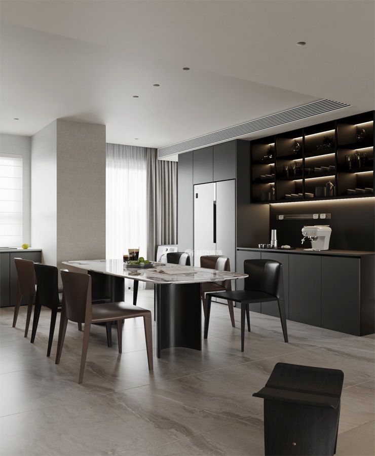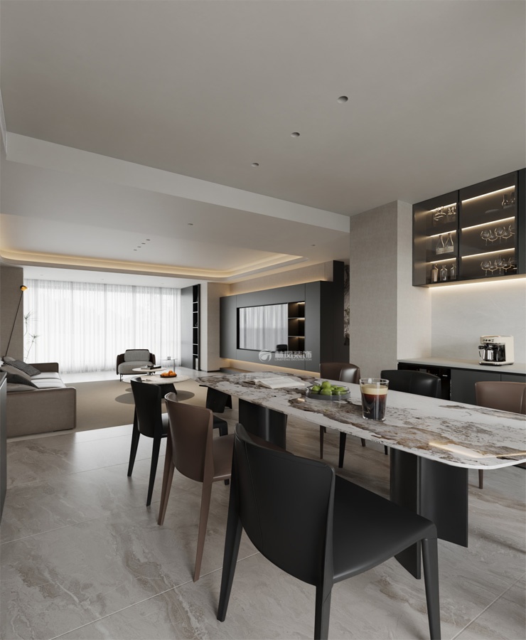 与客厅相同的柔光转,轻奢风的餐厅通常会选择大气的餐桌和餐椅,搭配优雅的吊灯和装饰画。餐桌上可以选择一些高档的餐具和装饰品。