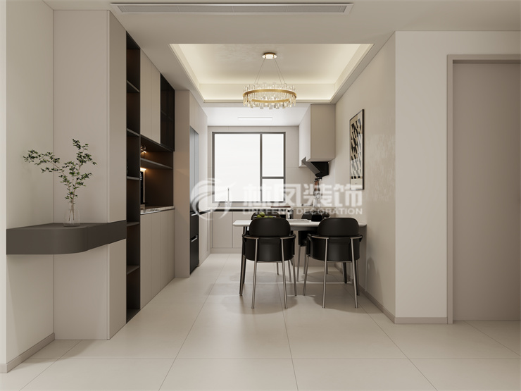 餐厅也是贯彻了实用简洁为主的理念,是一个4人位的餐桌,旁边链接着厨房的中岛台,用餐时会有更大的空间,而餐桌台面颜色也是中岛台面设计颜色进行了呼应。