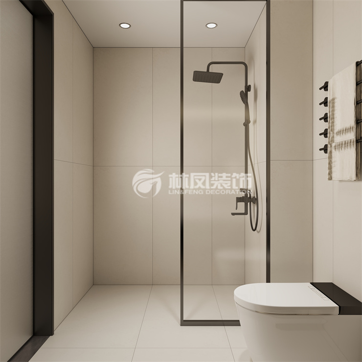 卫生间的墙壁地面使用的都是灰色性瓷砖,看起来融为一体,并且洗手台的柜体颜色也是深灰色,使卫生间看起来更加的干净整洁。