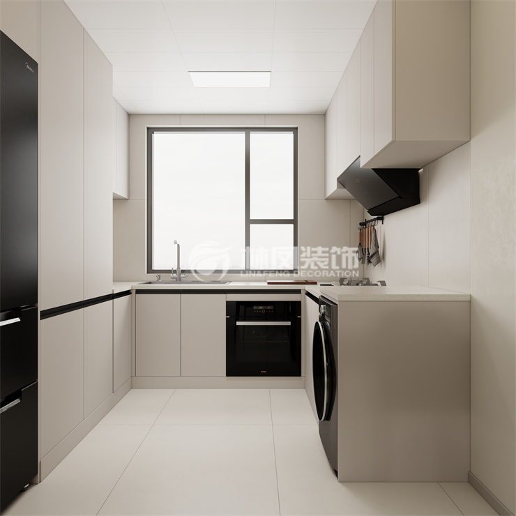 结构上采用开放式,餐厅和厨房设计在一起,这样看起来空间会宽敞很多。其厨房地面材料全部采用和客厅同样的瓷砖铺设而成,灶台台面全部采用的是白色,上橱柜用的是全屋的主色系,和鞋柜餐边柜以及电视柜一样的颜色,看起来更整体干净、利索、整洁。