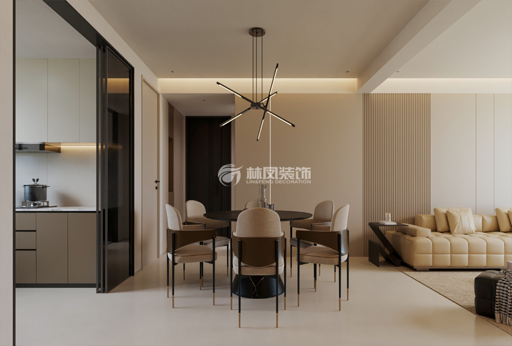与客厅、厨房紧密相连,开放式布局增强空间互动性与通透感。餐桌居中摆放,周围留出充足的活动空间,方便家人就座与起身,动线流畅自然,使整个公共区域融为一体。以浅米色、米白色等柔和色调为主
