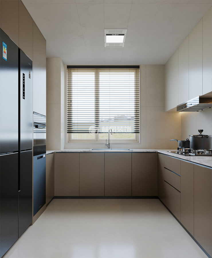 采用 L 型布局,充分利用墙角空间,流畅划分操作区、洗涤区、烹饪区,形成高效操作动线,减少来回走动距离,提升烹饪效率。 冰箱、烤箱、洗碗机等电器嵌入式设计,与橱柜一体化,视觉上简洁统一,还节省空间。以浅咖色、米白色为主色调,营造温暖舒适氛围。