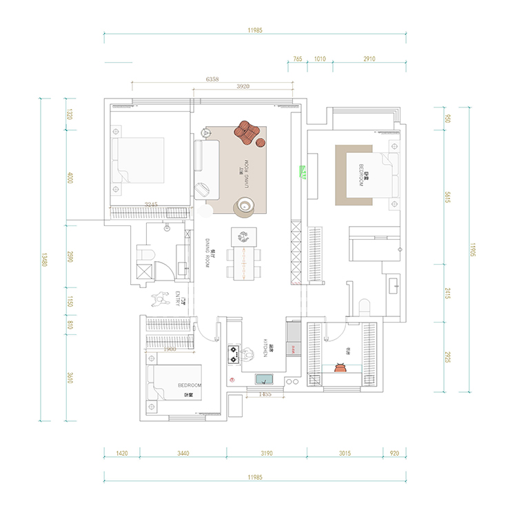 采用开放式布局,打破传统空间界限,使客厅与相邻空间自然过渡,增强空间通透感与互动性。合理规划家具摆放,确保动线流畅。整体色调以浅色系为主,如米白色、浅米色等,营造出温馨、柔和的氛围。搭配少量深色元素,增加视觉层次感与稳重感。地面选用质感细腻的大理石瓷砖,搭配柔软的米色地毯,冷暖材质结合,既显大气又增添舒适感。
