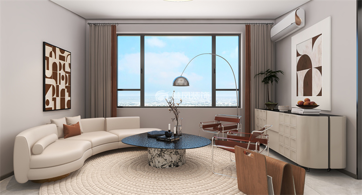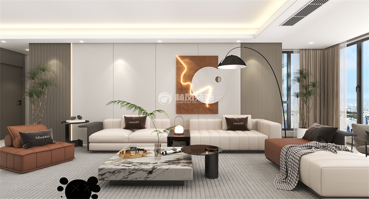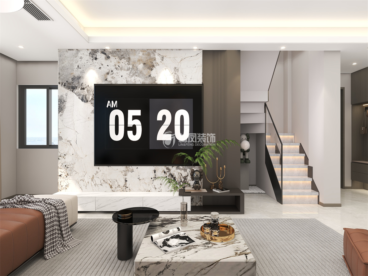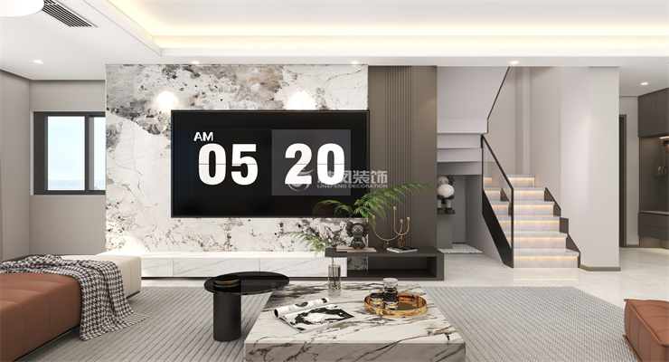 大理石背景墙突出了整个房间的特色,客厅沙发采用白色和棕红色作为点缀。