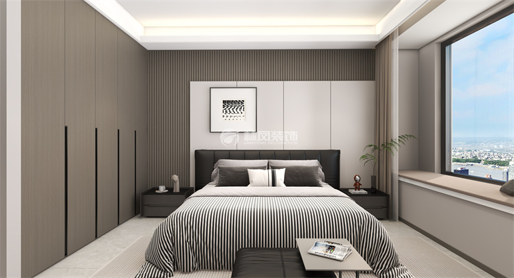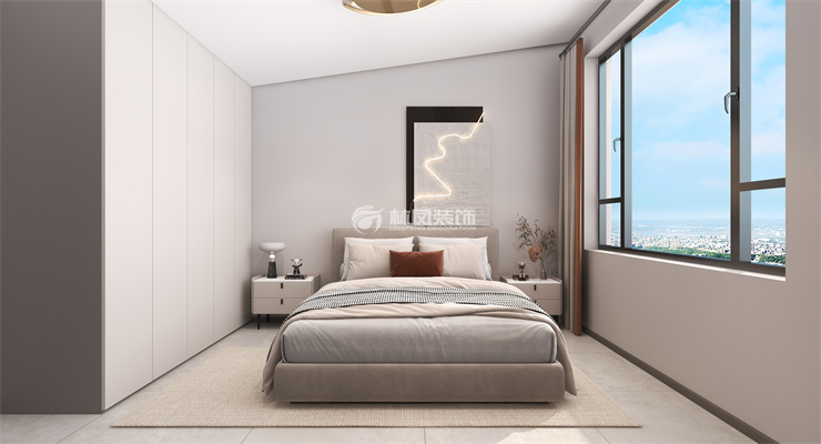 主卧室的背景墙也以白色为主,整体简约大方。家具颜色对比温和,用棕红色作为整个房间的点缀色。