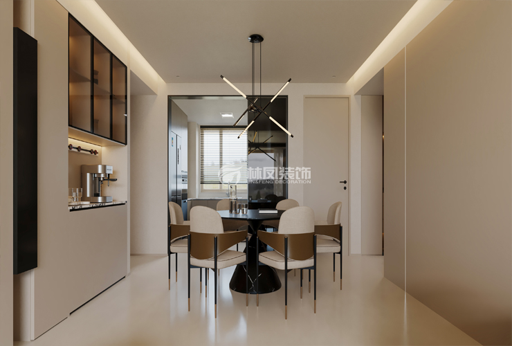 与客厅、厨房紧密相连,开放式布局增强空间互动性与通透感。餐桌居中摆放,周围留出充足的活动空间,方便家人就座与起身,动线流畅自然,使整个公共区域融为一体。以浅米色、米白色等柔和色调为主,