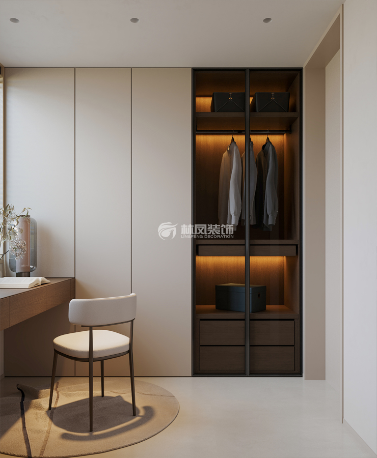 整体布局合理利用墙面空间,打造一体化收纳系统。根据空间形状与尺寸,采用 L 型布局,充分利用转角区域,提高空间利用率,同时保证活动动线流畅,方便使用者自由转身与拿取衣物。浅米色、深棕色为主色调。浅米色营造温馨柔和氛围